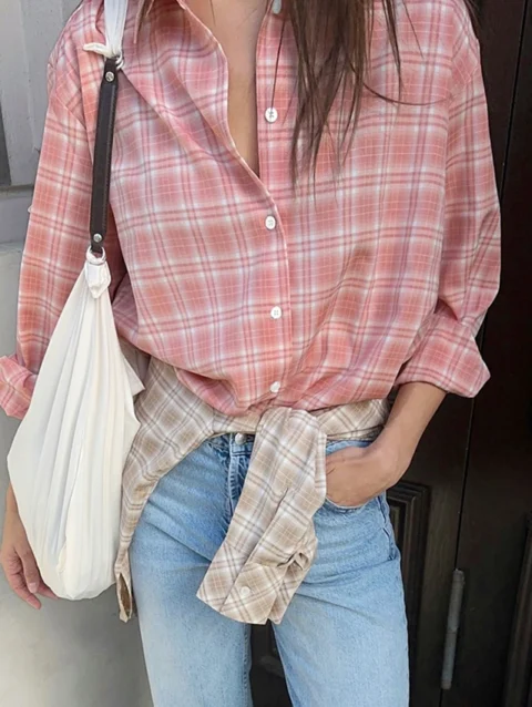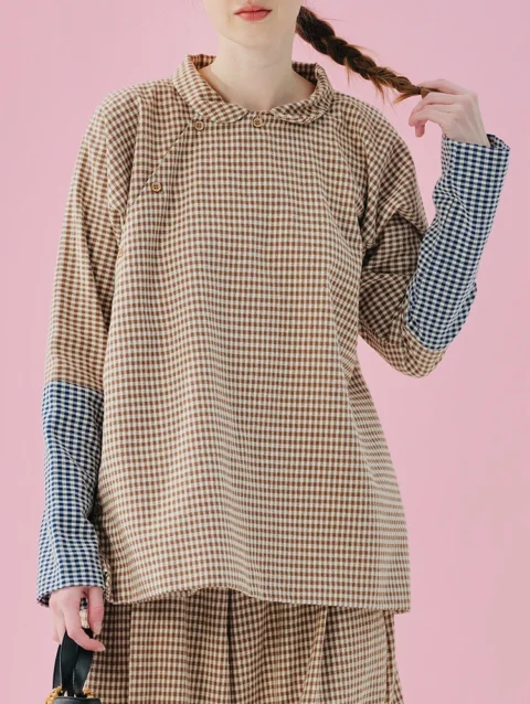 imakokoni 2025 Spring Pure Cotton Color Contrasting Checkered New Chinese style Hanging Back Shirt 244932