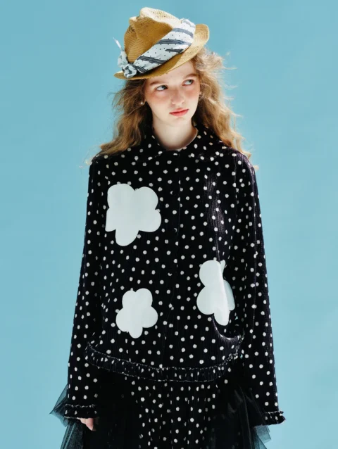 IMAKOKONI Original Design Long Sleeve Polka Dot Flower Shirt Lace Panel Black Single breasted Top Women’s Wear 233994