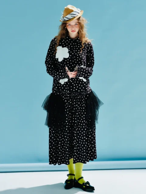IMAKOKONI Original Design Long Sleeve Polka Dot Flower Shirt Lace Panel Black Single breasted Top Women’s Wear 233994