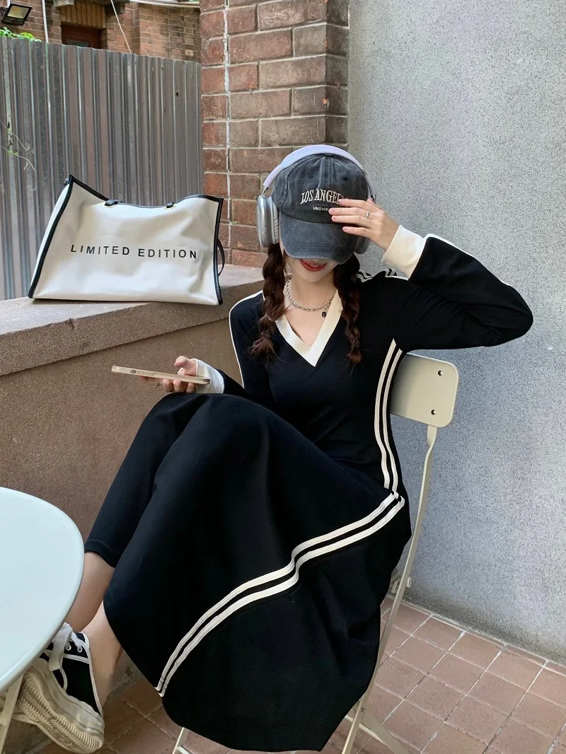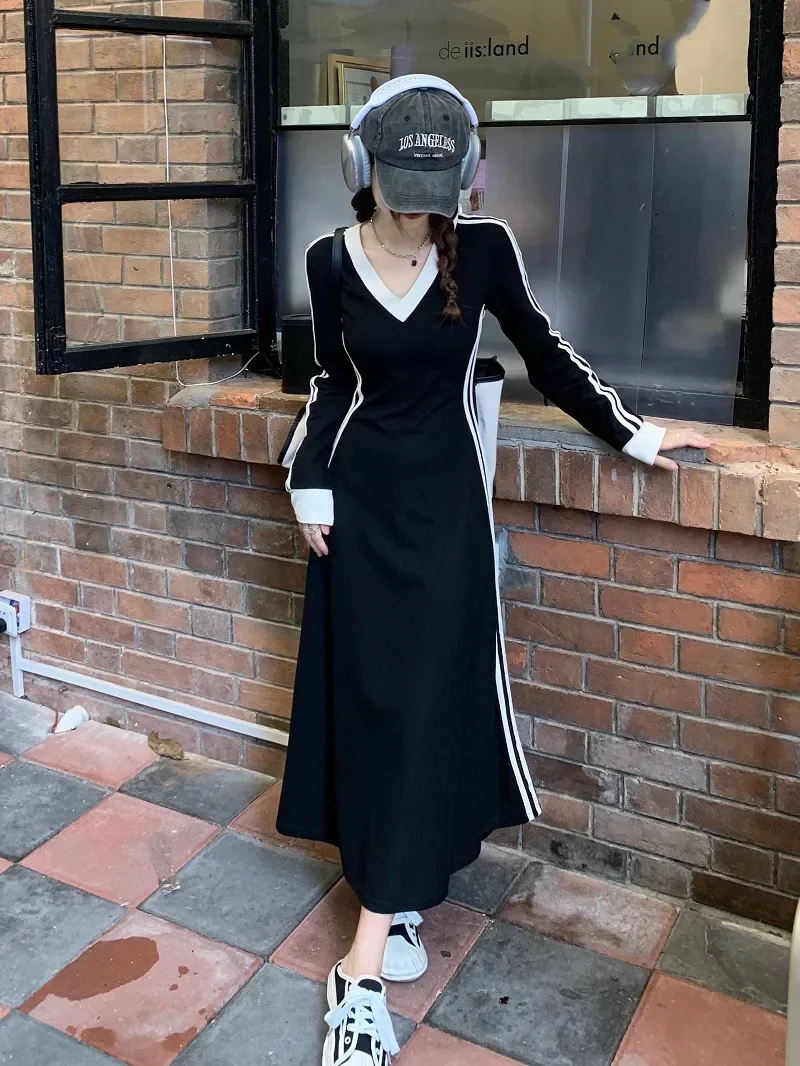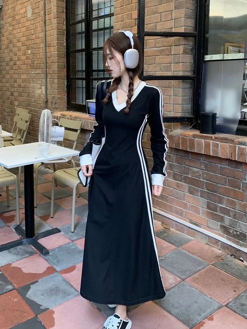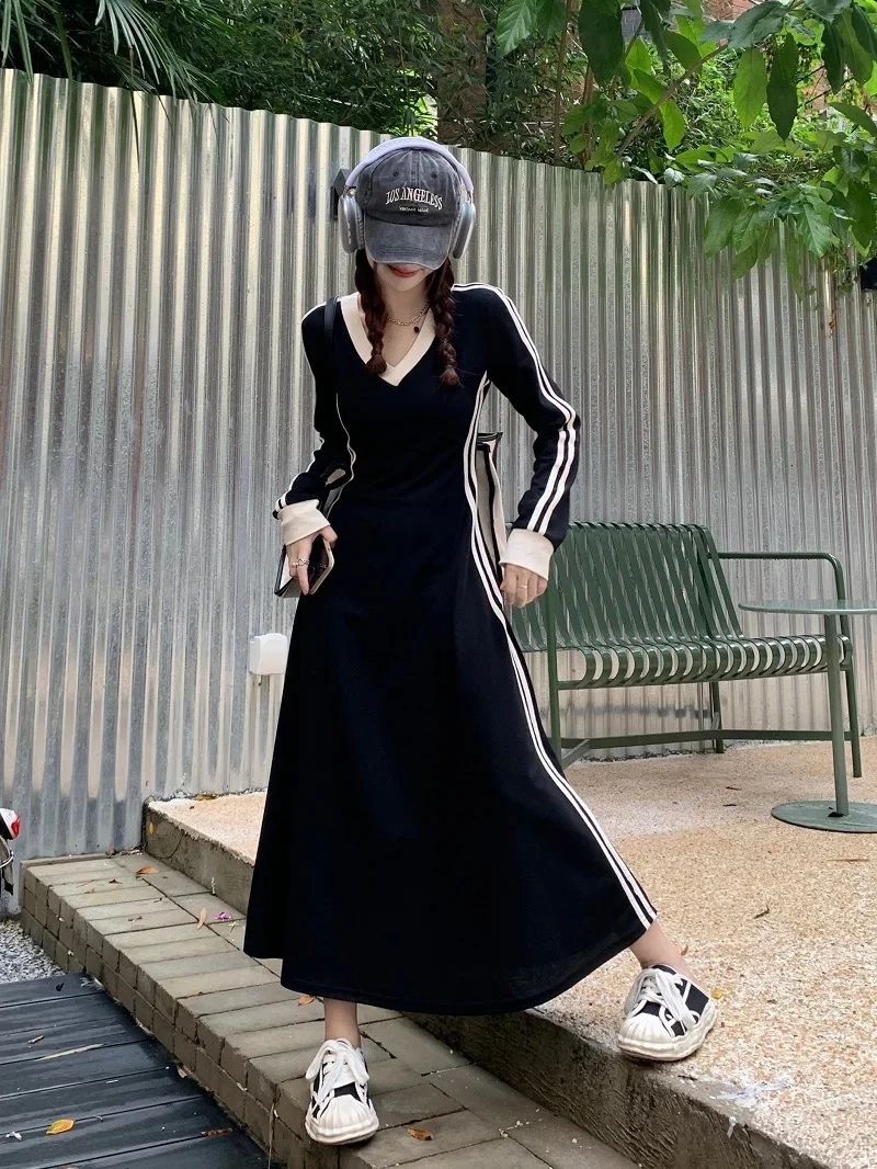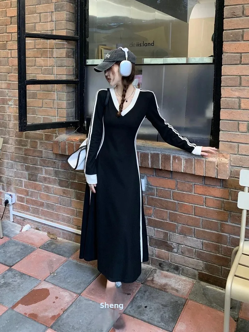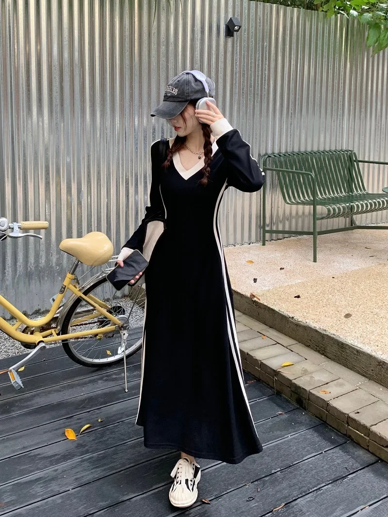 Black Long Knee-Length V-Neck Dress Women’s Waist-Cinching Slimming plus Size Full Sleeve Regular Fit Ankle-Length Dress