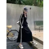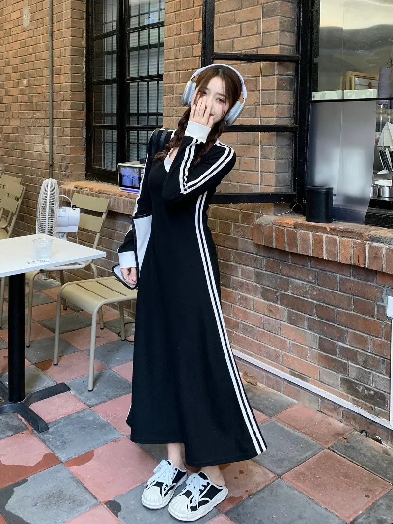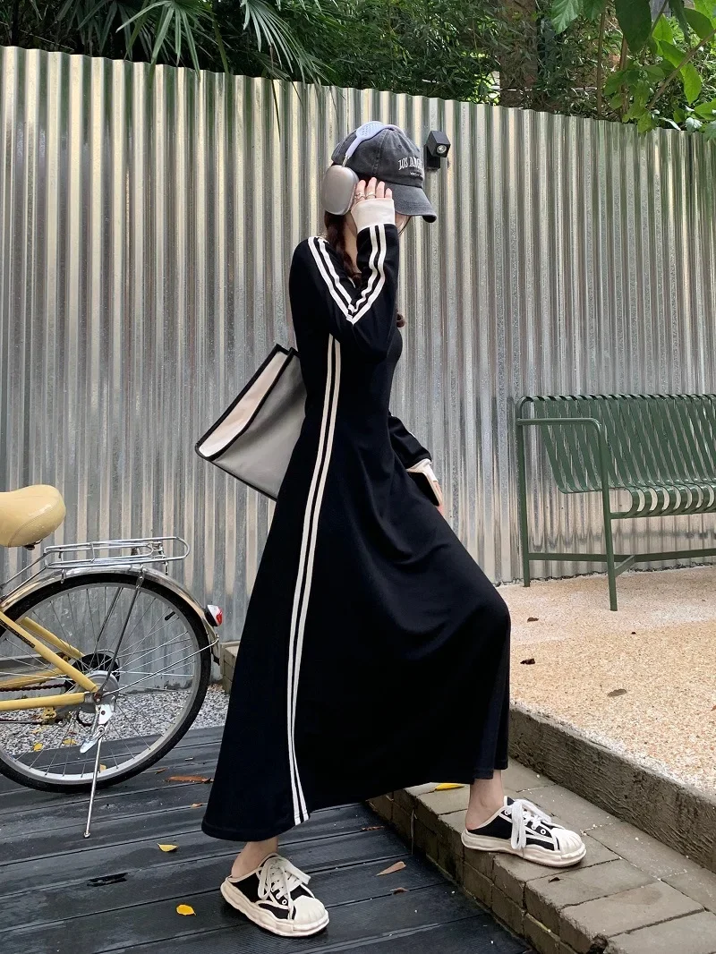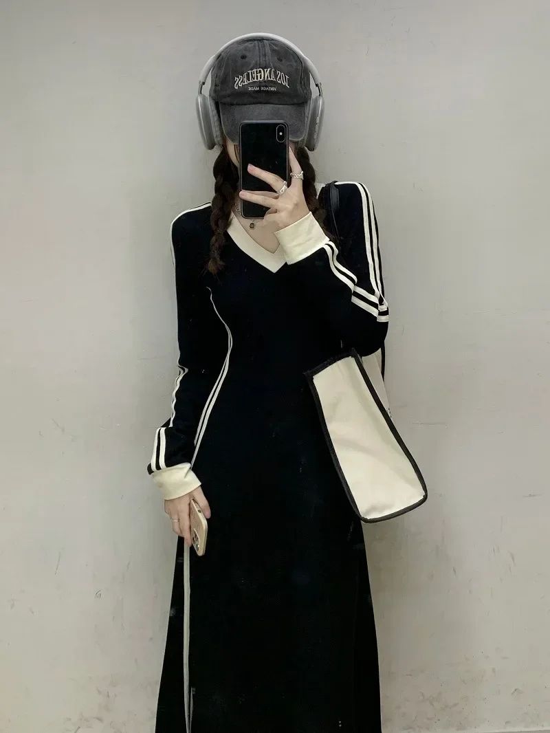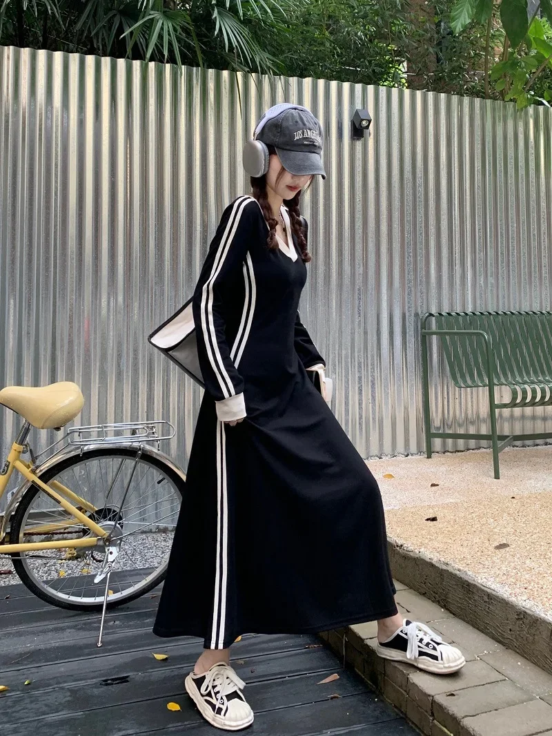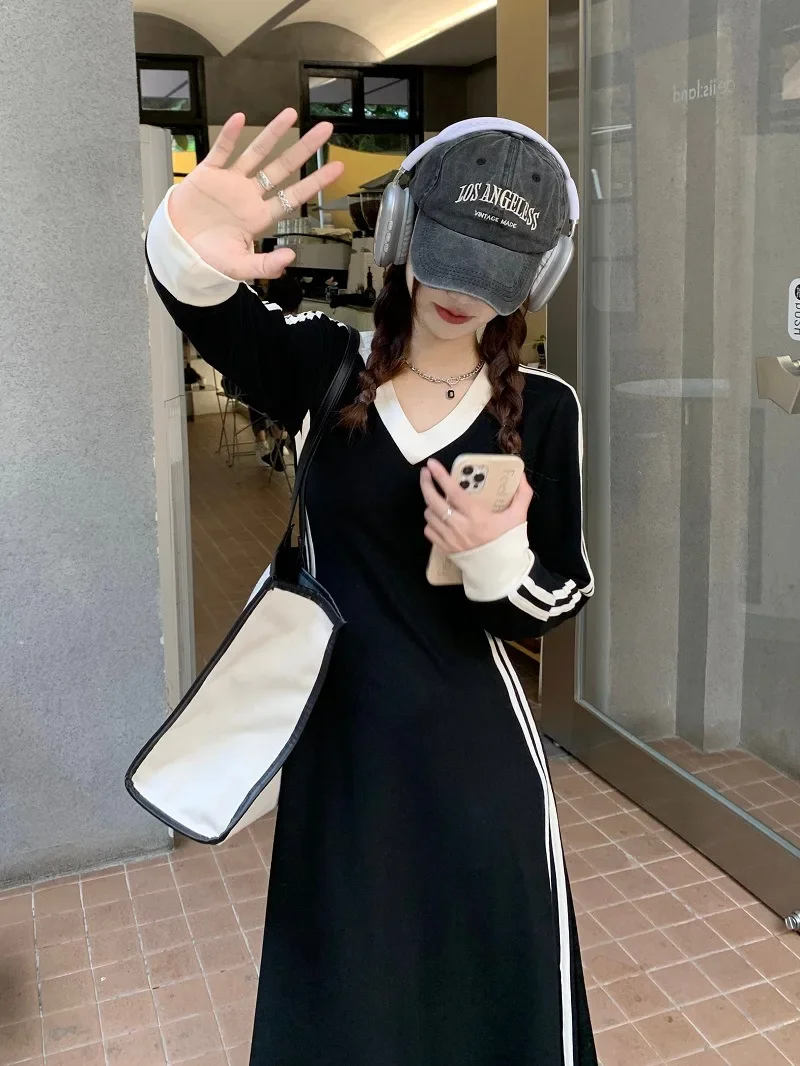 Black Long Knee-Length V-Neck Dress Women’s Waist-Cinching Slimming plus Size Full Sleeve Regular Fit Ankle-Length Dress