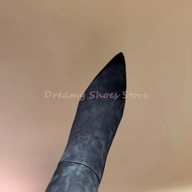 Black Suede Metal Heel Knee High Boots Women Leather Sword Design Pointed Toe Stiletto Boots Fashion Luxury Party Prom Lady Shoe
