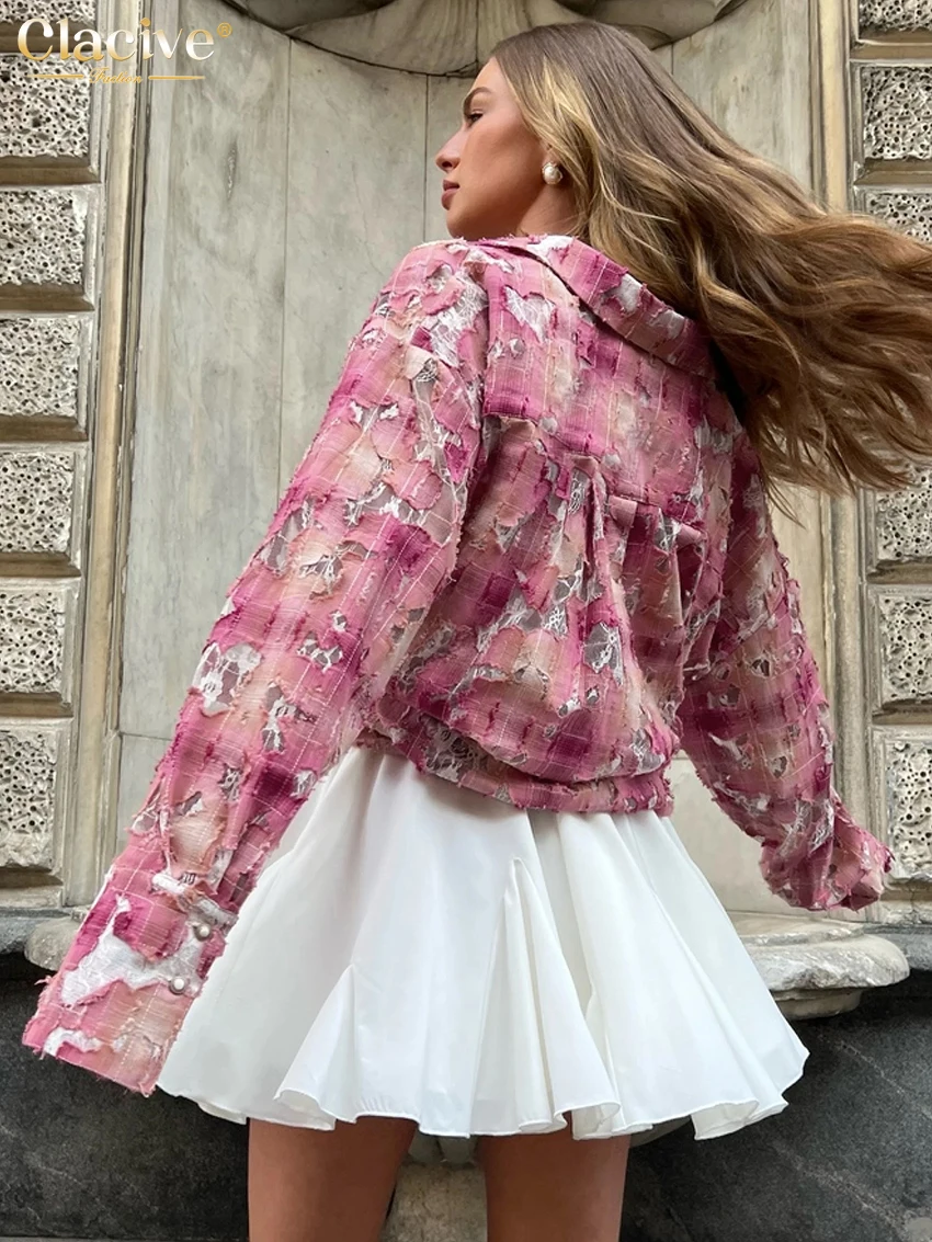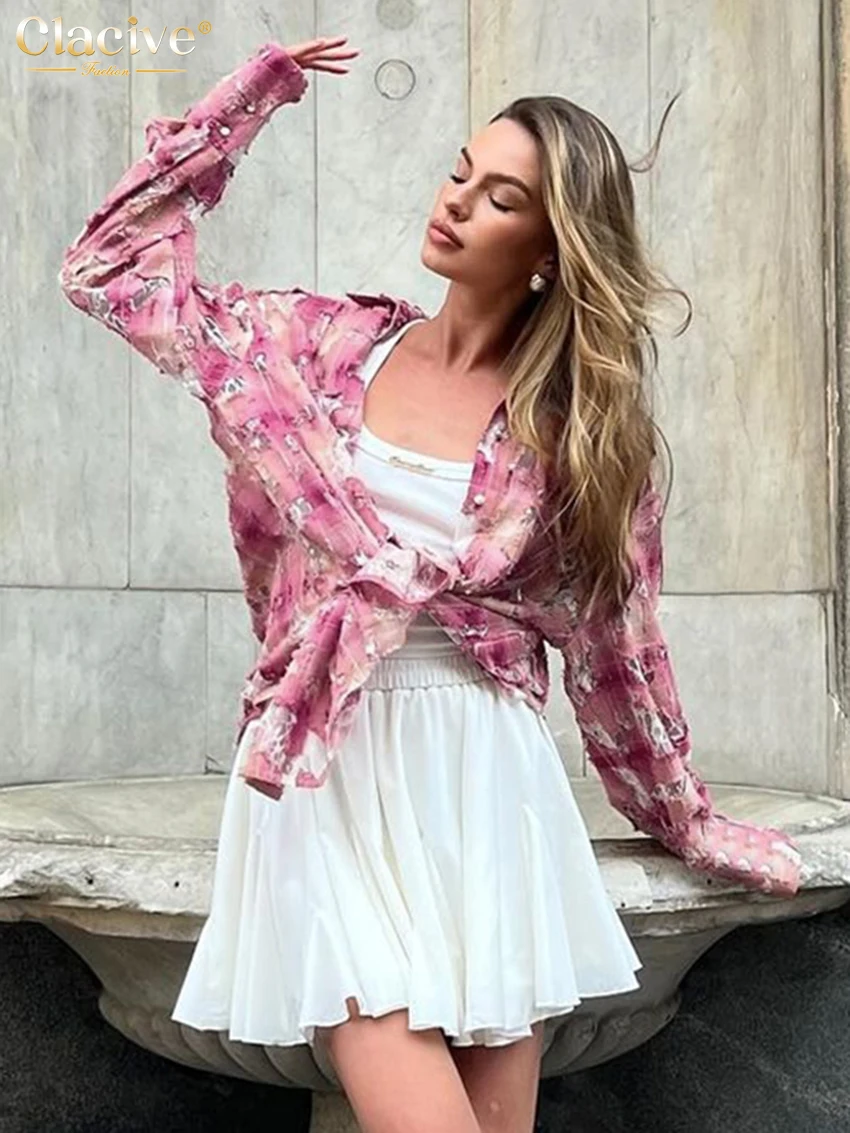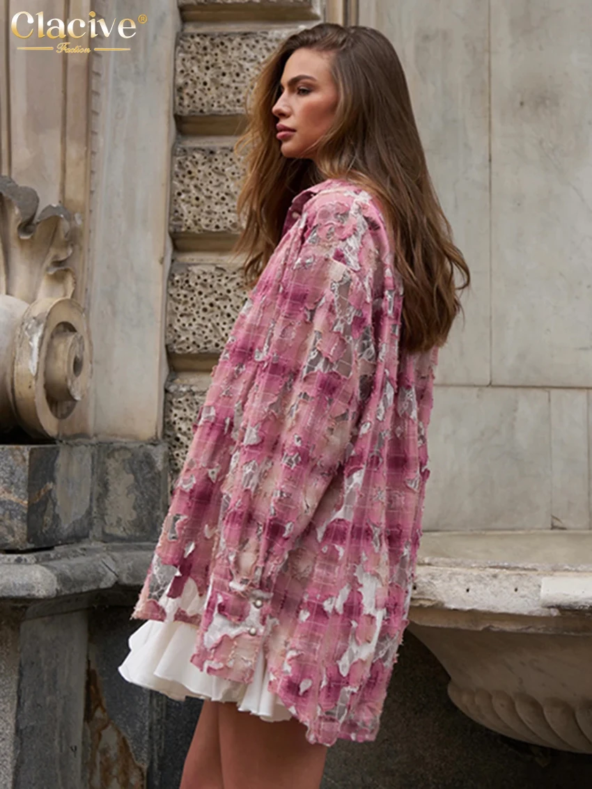 Clacive Fashion Loose Plaid Cotton Women’s Shirts 2025 Vintage Lapel Long Sleeve Blouse Elegant Lace Spliced Top Female Clothing