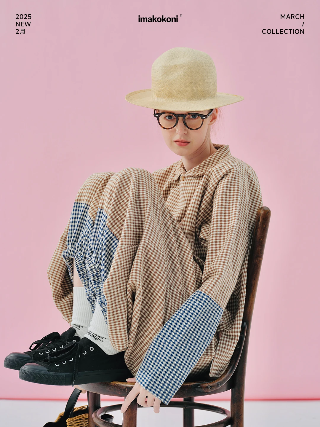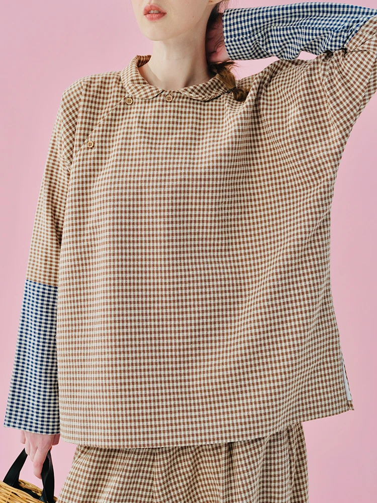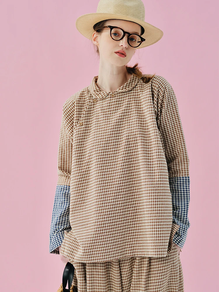 imakokoni 2025 Spring Pure Cotton Color Contrasting Checkered New Chinese style Hanging Back Shirt 244932