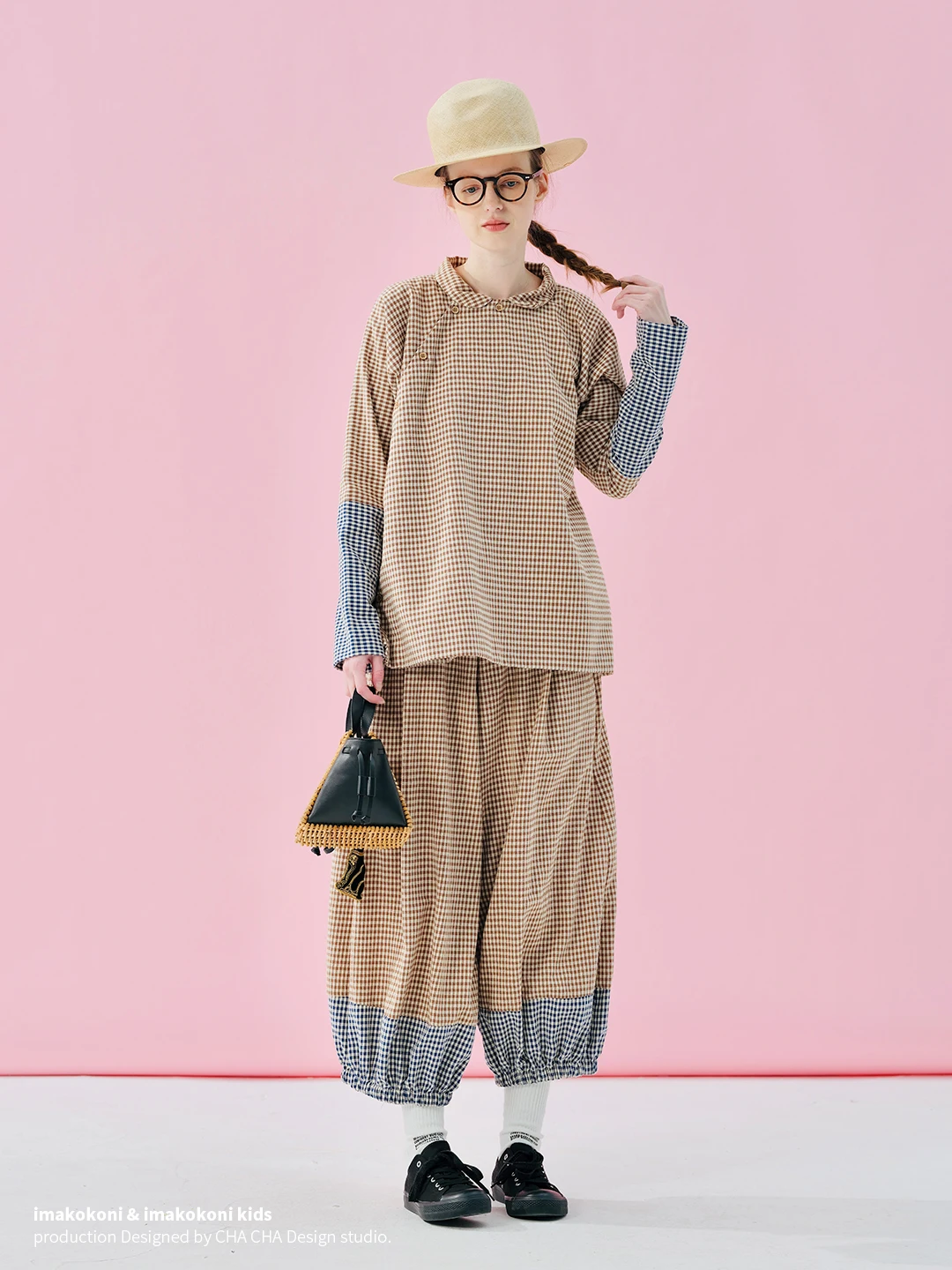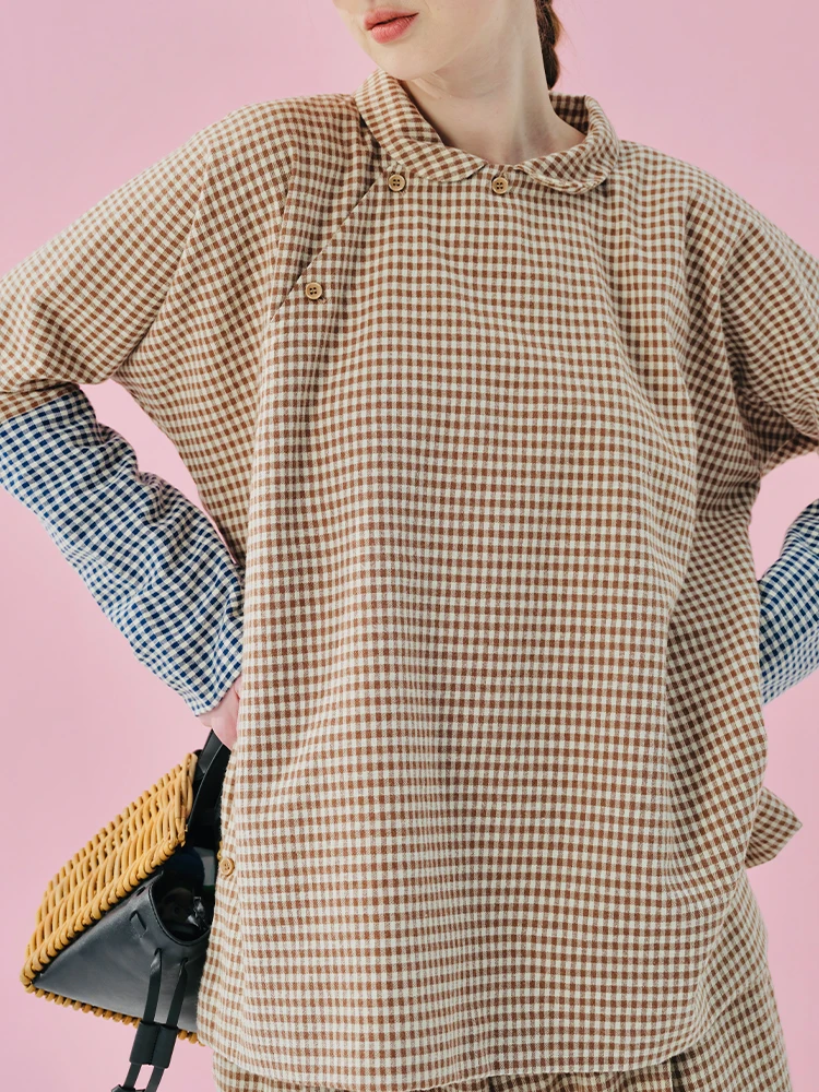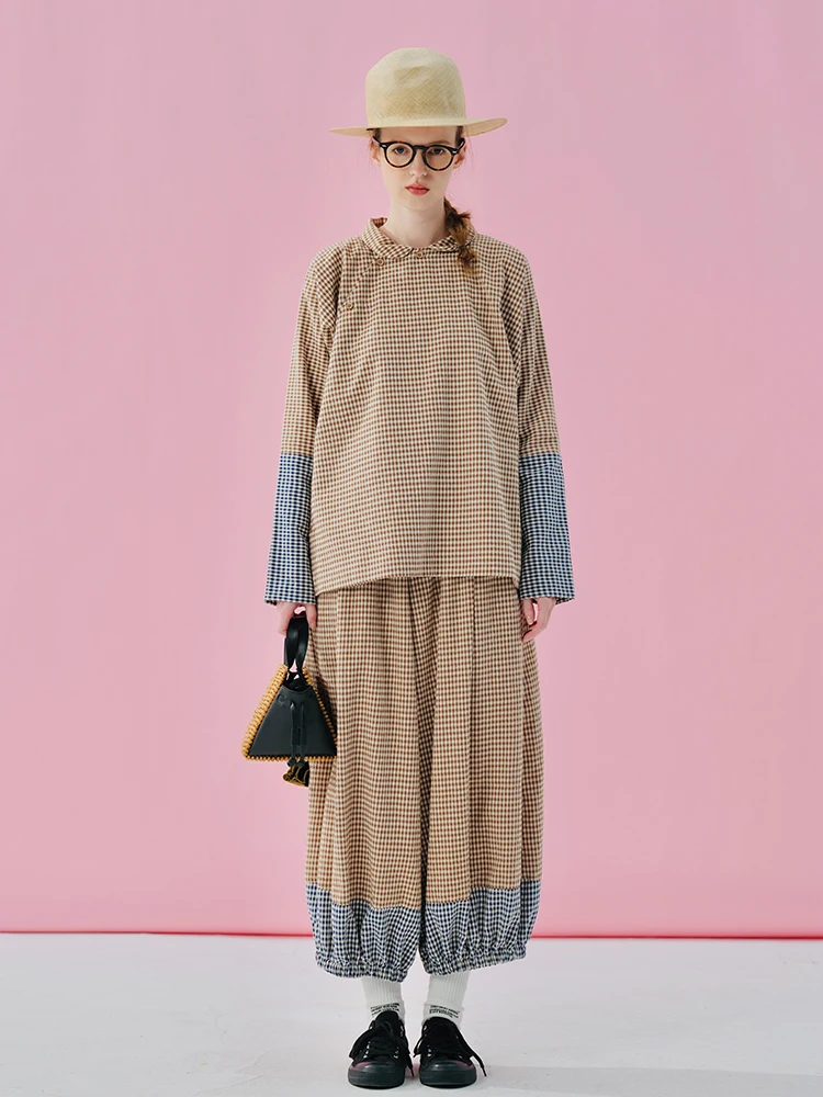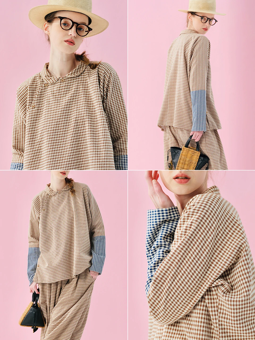 imakokoni 2025 Spring Pure Cotton Color Contrasting Checkered New Chinese style Hanging Back Shirt 244932