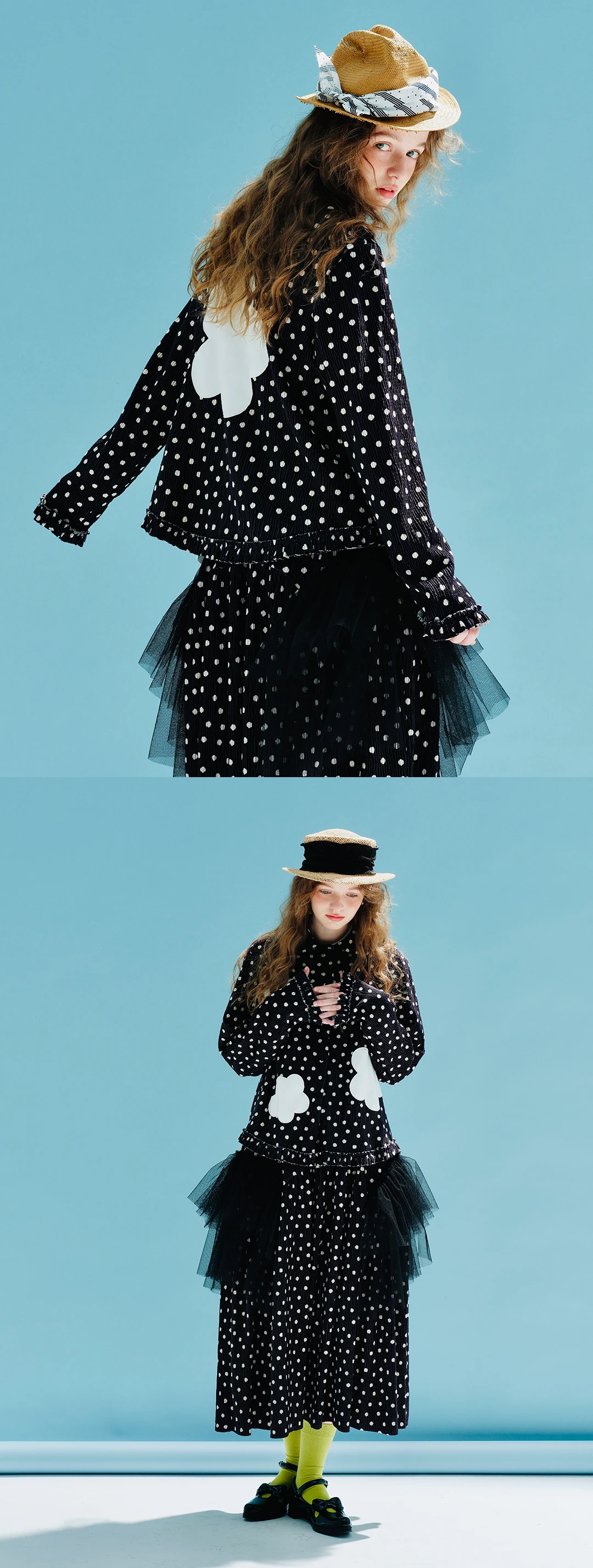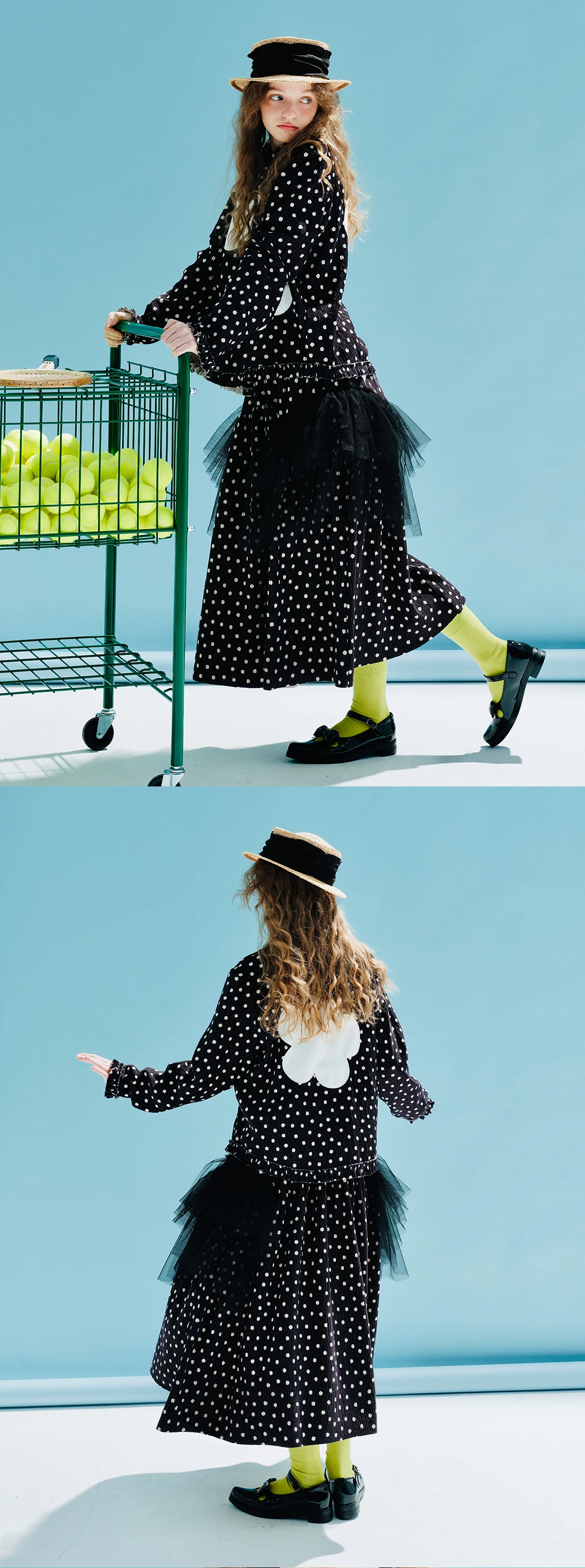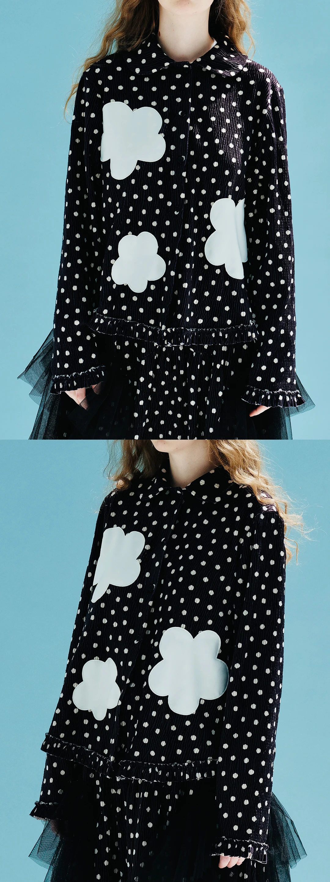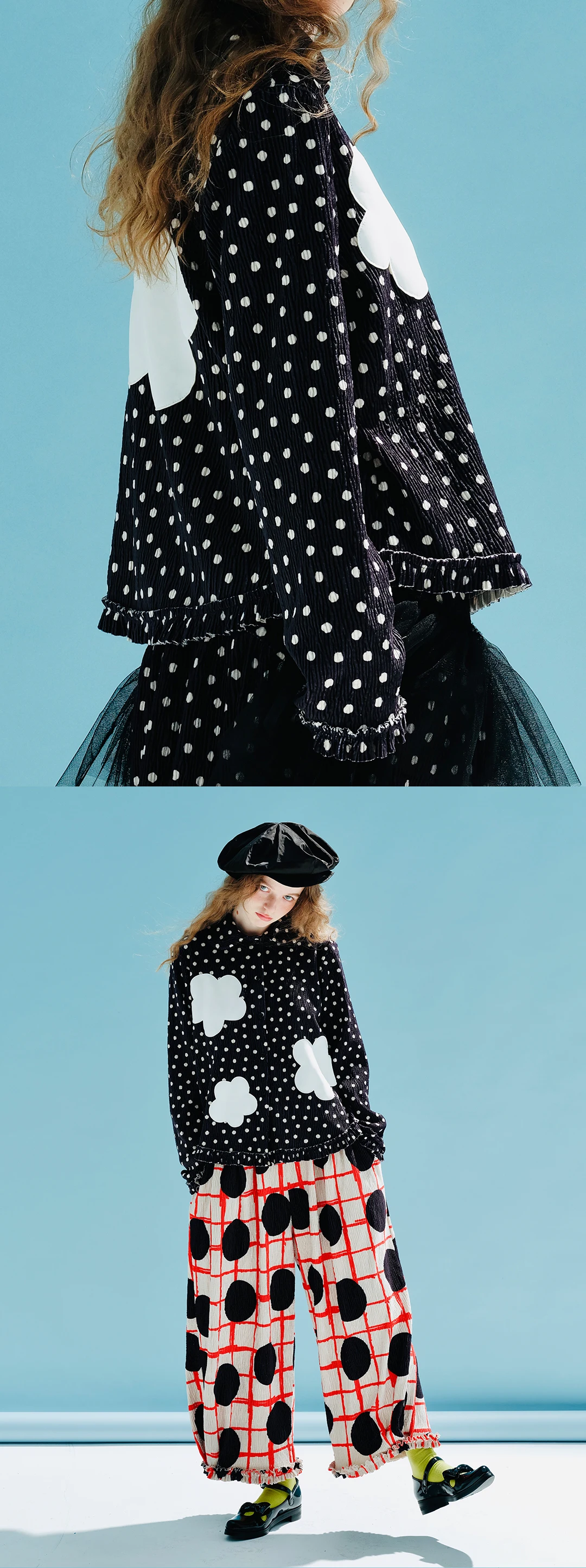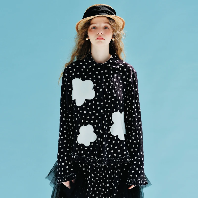 IMAKOKONI Original Design Long Sleeve Polka Dot Flower Shirt Lace Panel Black Single breasted Top Women’s Wear 233994