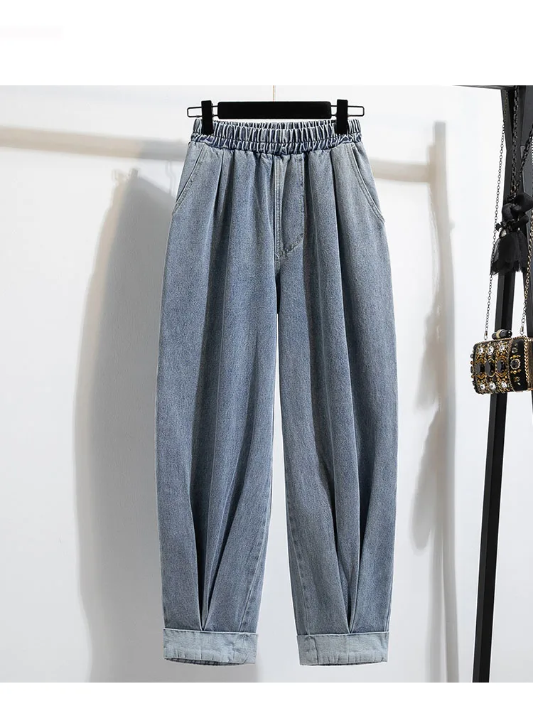 Plus Size Jeans For Women 2025 Autumn New Arrival High Elastic Waist Harem Denim Pants Korean Style Fashion Blue Jeans Woman