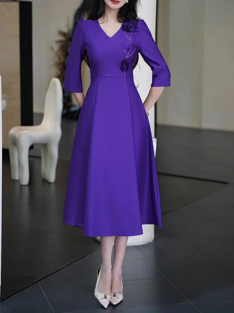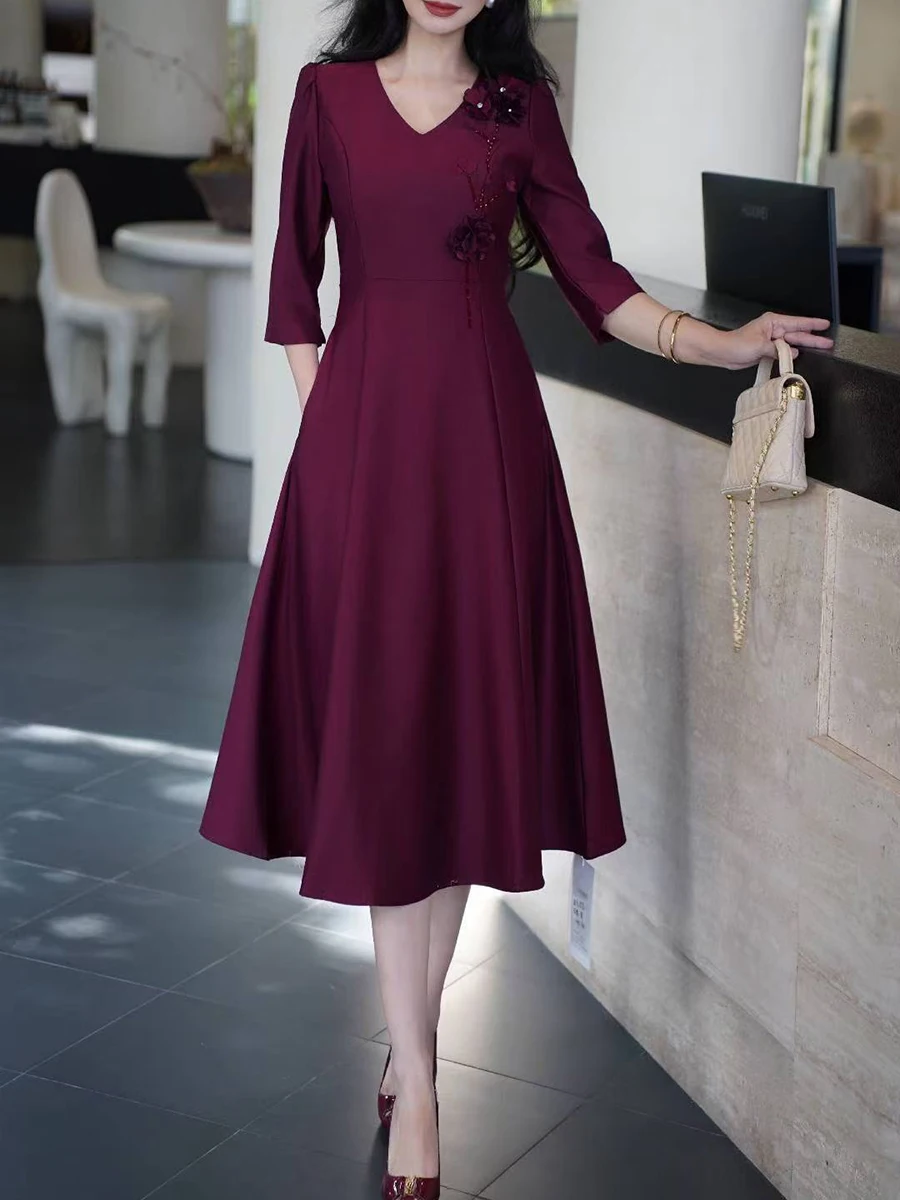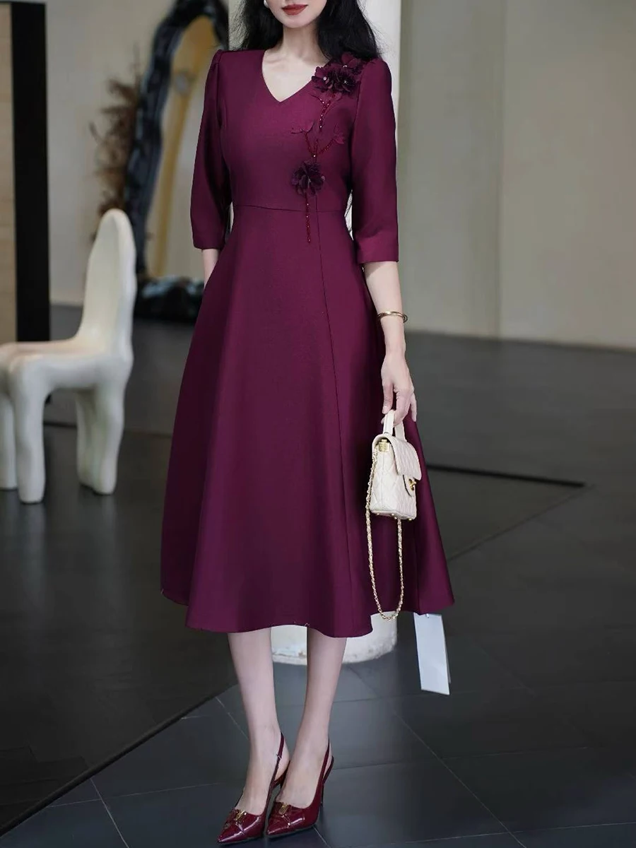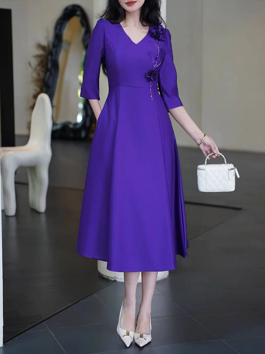 VGH Elegant Office Spliced Appliques Dresses for Wome V Neck Three Quater Sleeves High Waist Temperament A Line Dress Female New