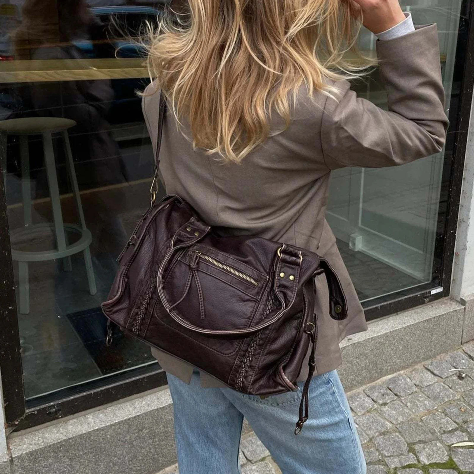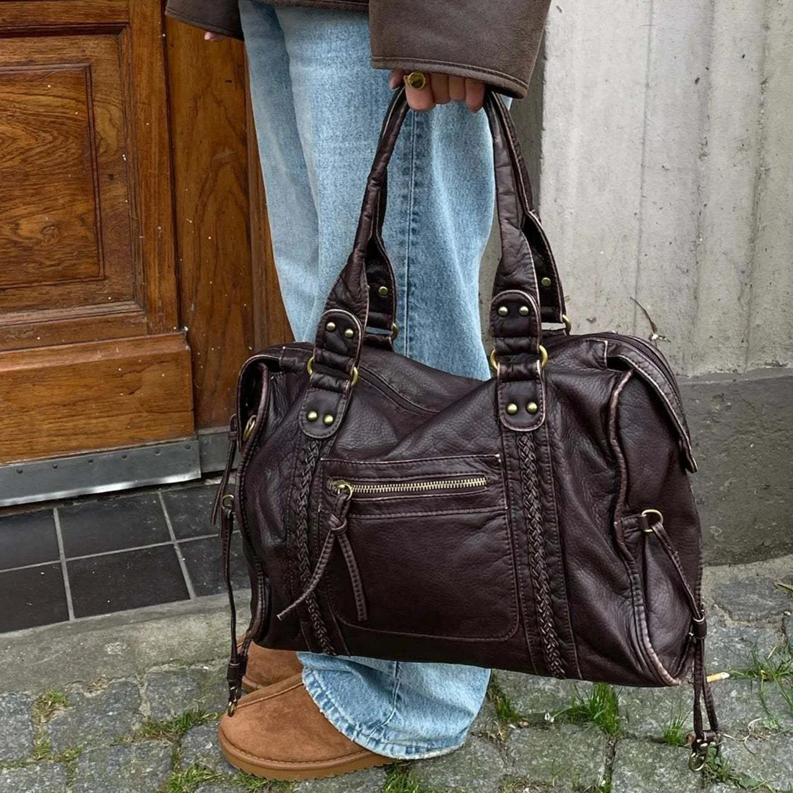 Retro Motorcycle Bag PU Leather Single Shoulder Bag Large Capacity Top Handle Bag for Women Work Travel Daily Shopping