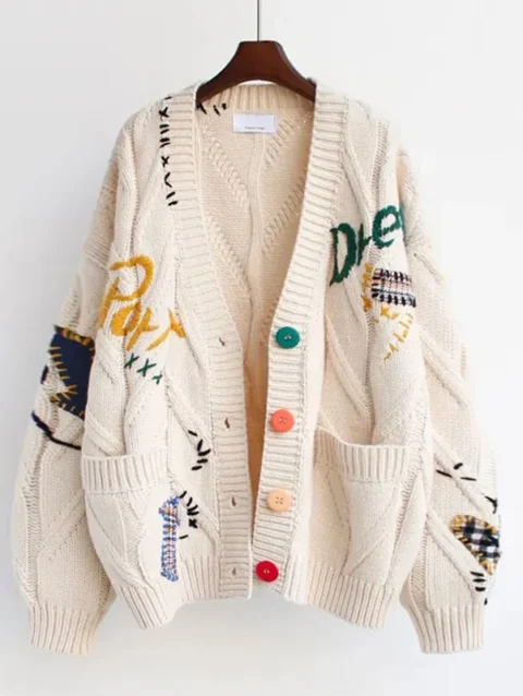 Embroidery Patchwork High Street Thick Knit V-Neck Women’s Cardigan Sweater Single Breasted Cardigan For Women Clothing Winter