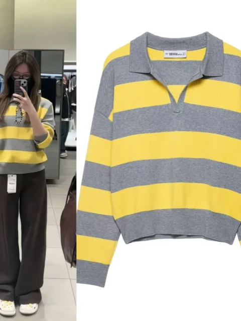 ETJ 2025 Autumn women’s new line street style fashion yellow wide stripe polo neck loose version of long-sleeved sweater