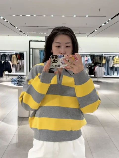 ETJ 2025 Autumn women’s new line street style fashion yellow wide stripe polo neck loose version of long-sleeved sweater